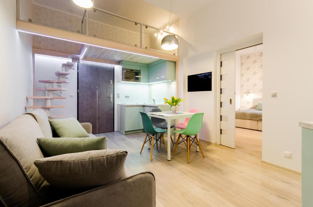 Luxurious apartments Turnau City Aparthotel are housed in a modern complex in Kraków’s centre, 8 minutes’ walk from the Main Railway Station. All offer internet and fully equipped kitchenettes. The apartments at the Turnau City Aparthotel come with a kitchenette, equipped with a refrigerator, cooker, microwave and all the necessary dishes and kitchen utensils. At the Turnau City Aparthotel, you will be just 10 minutes’ walk from Kraków’s Main Market Square. Galeria Krakowska Shopping Centre is only a few steps away. A restaurant, where guests can have breakfast, can be reached in 2 minutes on foot.